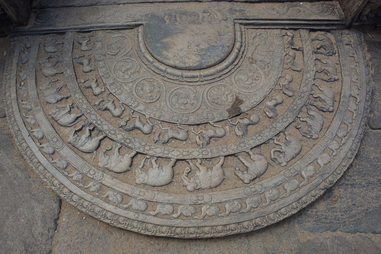 The carvings on the Sadhakadapahana hold significant symbolism in Buddhist teachings. The outermost band often depicts a series of geese or swans, symbolizing the transience of life and the importance of spiritual liberation. Moving inward, the following bands may feature depictions of elephants, horses, lions, and bulls, representing different stages of existence and the challenges one must overcome on the path to enlightenment. The innermost band, closest to the central lotus, is typically adorned with intricate foliage and decorative motifs. These patterns symbolize the abundant growth of wisdom and compassion that can be achieved through the practice of Buddhism. The overall composition of the Sadhakadapahana presents a visual narrative of the Buddhist path, guiding visitors towards the central lotus of enlightenment. The Sadhakadapahana holds not only symbolic value but also serves as a testament to the artistic skill and craftsmanship of ancient Sri Lankan artisans. The intricate detailing and precision of the carvings showcase the mastery of stone carving techniques prevalent during the time when these moonstones were created. Visiting a Buddhist temple or monastery that features a Sadhakadapahana offers a unique opportunity to witness and appreciate this exquisite architectural element. The moonstone serves as a reminder of the profound teachings of Buddhism, encouraging contemplation and introspection as visitors enter the sacred space. It sets the tone for the spiritual experience that awaits within the temple or monastery. The Sadhakadapahana has become an iconic symbol of Sri Lankan architecture and cultural heritage. Many ancient temple complexes in Sri Lanka, such as Anuradhapura, Polonnaruwa, and Kandy, boast magnificent examples of moonstones. They are not only objects of historical and cultural significance but also sources of inspiration for contemporary Sri Lankan artists and architects. In conclusion, the Sadhakadapahana, or Moonstone, is a remarkable architectural feature that holds great significance in Sri Lanka's Buddhist heritage. Its intricate carvings and symbolic motifs convey the essence of Buddhist teachings and guide visitors on the path to enlightenment. As a visually stunning and spiritually profound element, the Sadhakadapahana continues to captivate and inspire all who encounter it, preserving the rich cultural and religious heritage of Sri Lanka.